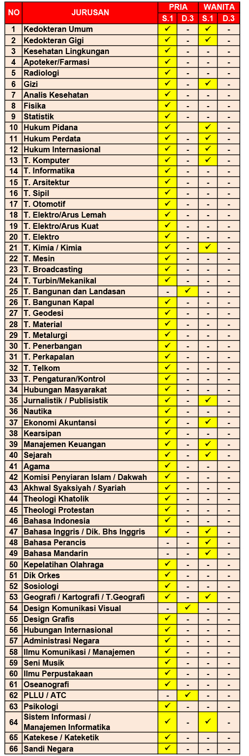 - Tinggi badan minimal pria 163 cm beserta wanita 157 cm.